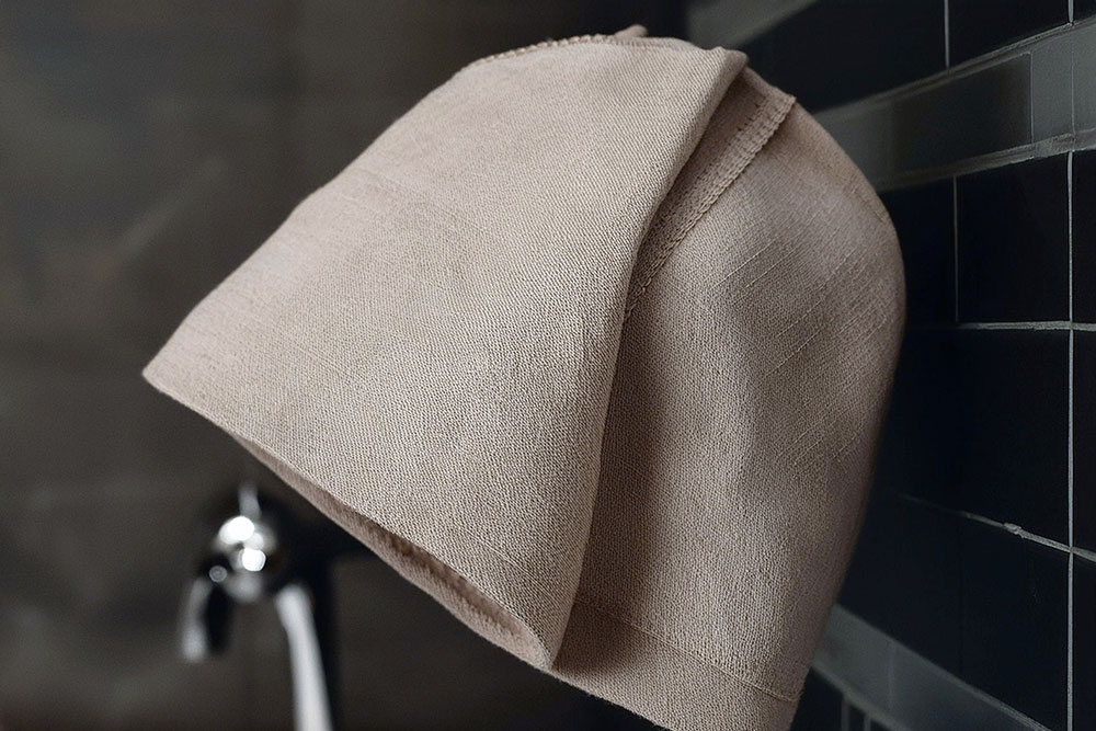 ビワイチを楽しんだ1日の最後にサウナでくつろいでいただけるようにと考案されたサウナグッズ。シンプルなデザインのサウナハットです。