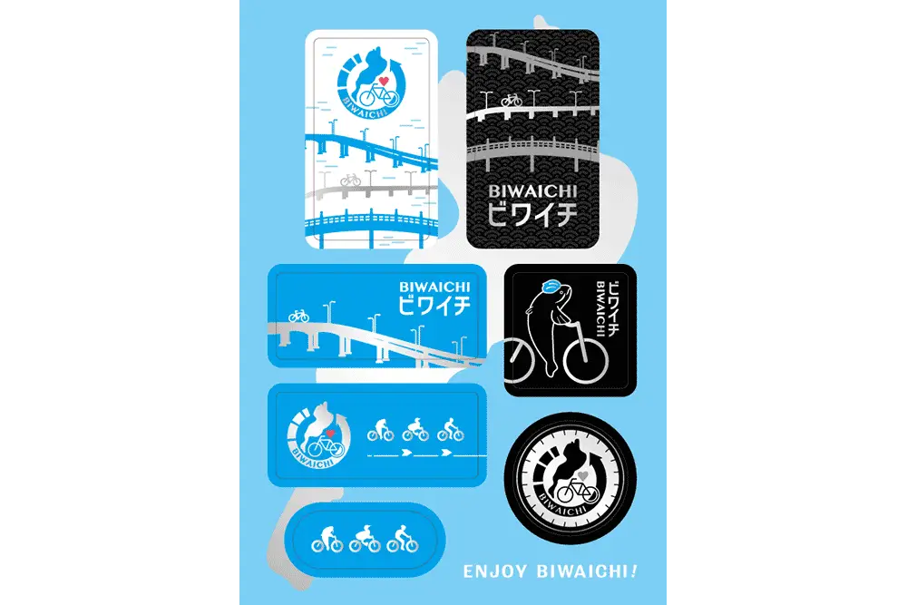 ビワイチロゴと、琵琶湖大橋・近江大橋・瀬田の唐橋をデザインしたステッカー。